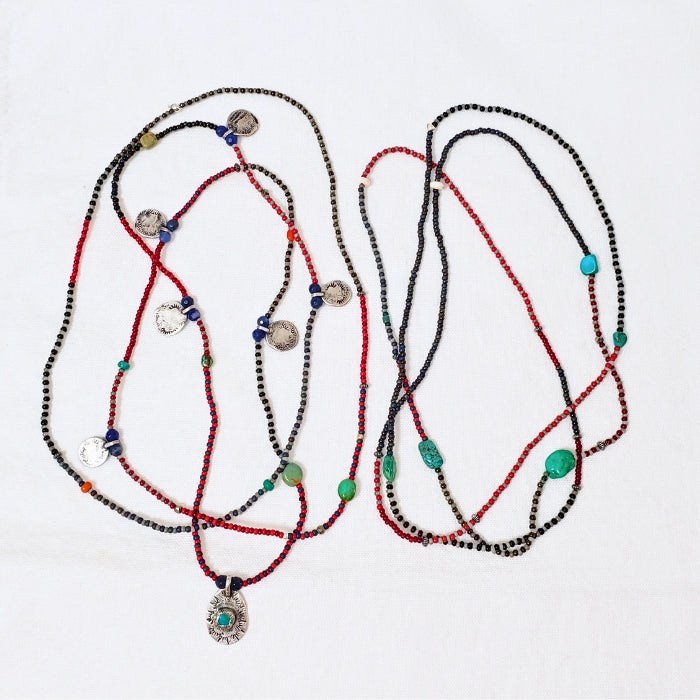 The nomadic spirit necklace is long and light, perfect for layering. This necklace comes with a set of two (2) separate strands. Each is adorned with alternating jewel toned bead work, with random gemstone beads strung throughout. A collection of hand forged sterling silver charms span the length of necklace. A single rustic sterling and turquoise pendant hangs from the bottom.
