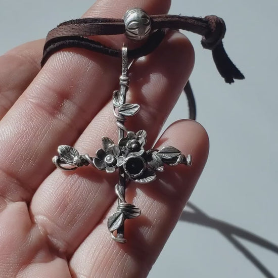 Formed in solid sterling silver, this lightweight cross pendant features a slender silver cross wrapped in a sculptural vine, detailed with organic leaves and floral elements.