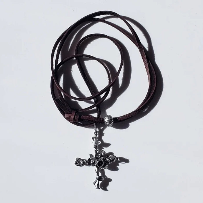 This cross is hung on a thin brown leather cord, accented by a sterling bead stamped with petal motifs that slides along the length of the necklace.