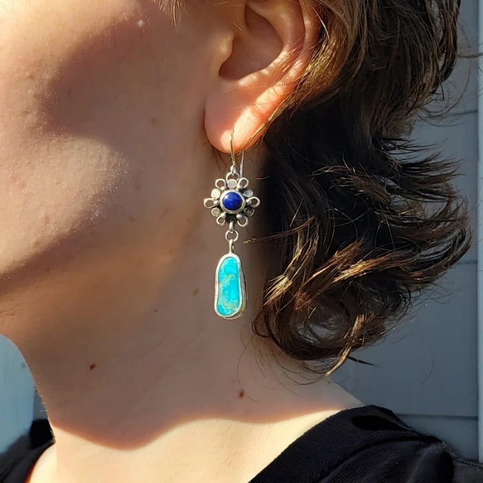 Blue lapis and Kingman turquoise add a lively mix to these hand shaped silver flower drops. Each flower is made from a series of hand shaped petals adding depth and dimension to this design. These have just enough size and color to embrace a statement style, yet are thoughtfully designed for all day comfort and anytime wear. Hung from handmade sterling wires.