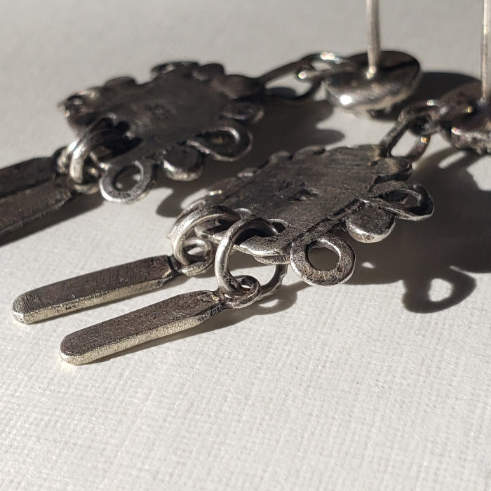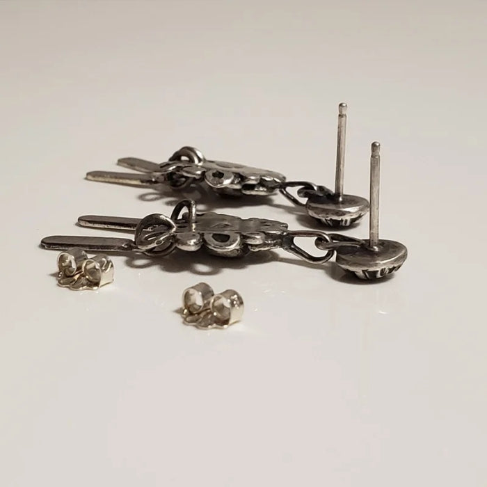 One of a kind earrings, handcrafted to embrace an old world charm. Light and easy for anytime wear, these silver and red coral earrings are full of subtle movement with rustic features. Each earring securing comfortably on the ears with sterling posts and ear nut closures.