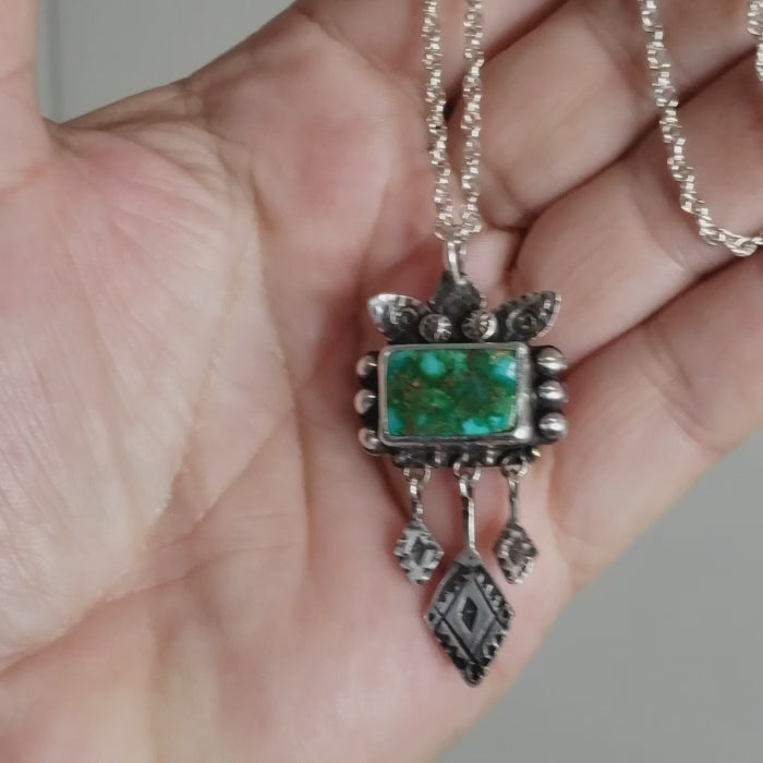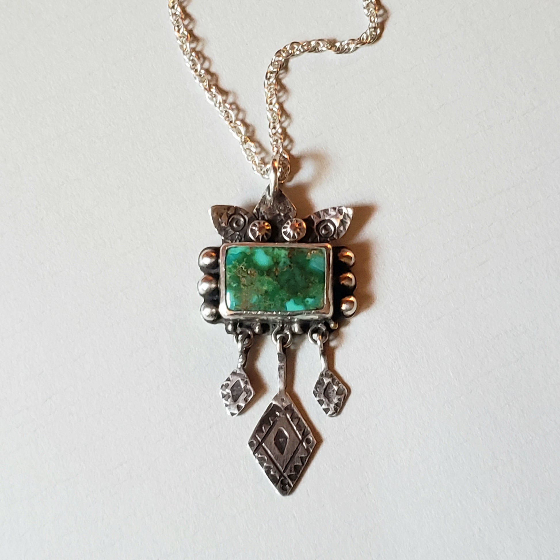 Hand shaped from solid sterling silver and vibrant Sonoran turquoise gemstone. This piece is a one of a kind turquoise necklace is crafted to wear anytime with the quality to last for generations.